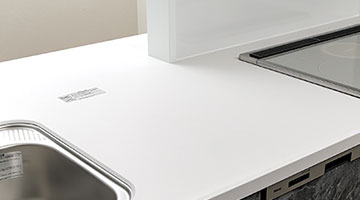 継ぎ目がなく1枚で仕上がる人造大理石トップ。油汚れもさっと拭くだけでキレイになり、毎日のお手入れは水拭きでOKです。