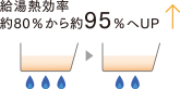 廃棄熱を再利用することで、少ないガス使用量で従来品と同じ湯量を沸かせます。従来型※1と比べて給湯効率は95%※2に向上しました。