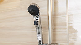 シャワーフックを前後上下にスライドでき、お好みの角度に調整可能。ボタンを押すだけで止水ができる節水仕様です。