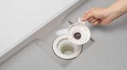 排水口洗い場からの水で渦を巻く構造で、パッとゴミがまとまって、簡単に捨てることができます。
