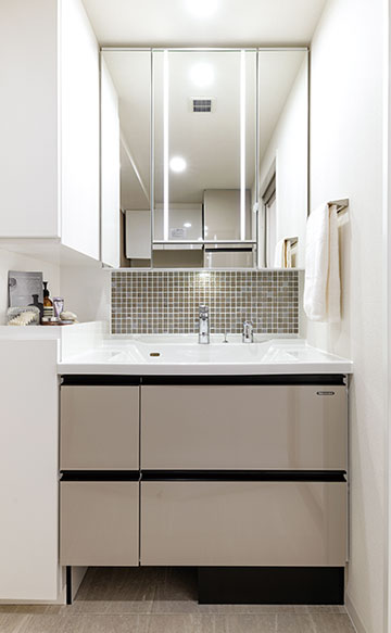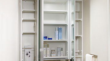 大型の3面ミラー内部には、使い勝手のよい豊富な収納スペースを確保しています。