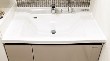 洗面化粧台の収納は見やすく出し入れしやすいスライド式。優しく静かに閉まるソフトクローズ仕様を採用しました。